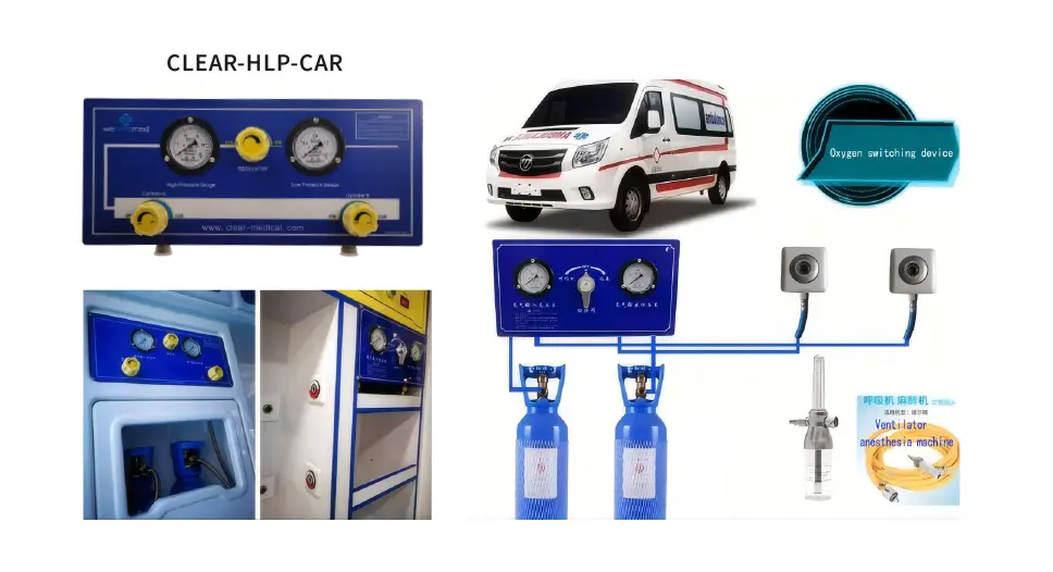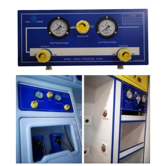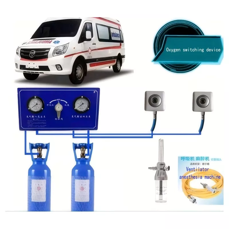 1. To urządzenie jest odpowiednie do karetek pogotowia o dużym zużyciu tlenu. Butelki tlen pod wysokim ciśnieniem jest wprowadzany do głównej rury panelu sterowania przez metalowy wąż. Po zmniejszeniu tlenu wysokociśnieniowego jest on transportowany do terminalu tlenu przez rurę niskiego ciśnienia, która jest używana jako źródło tlenu do użytku awaryjnego. Jego zasadą pracy jest dekompresja tlenu pod wysokim ciśnieniem do niskiego ciśnienia, odpowiednio przez własne rurociągi do terminalu tlenu, do zacisku tlenu i portu wentylatora do użycia.