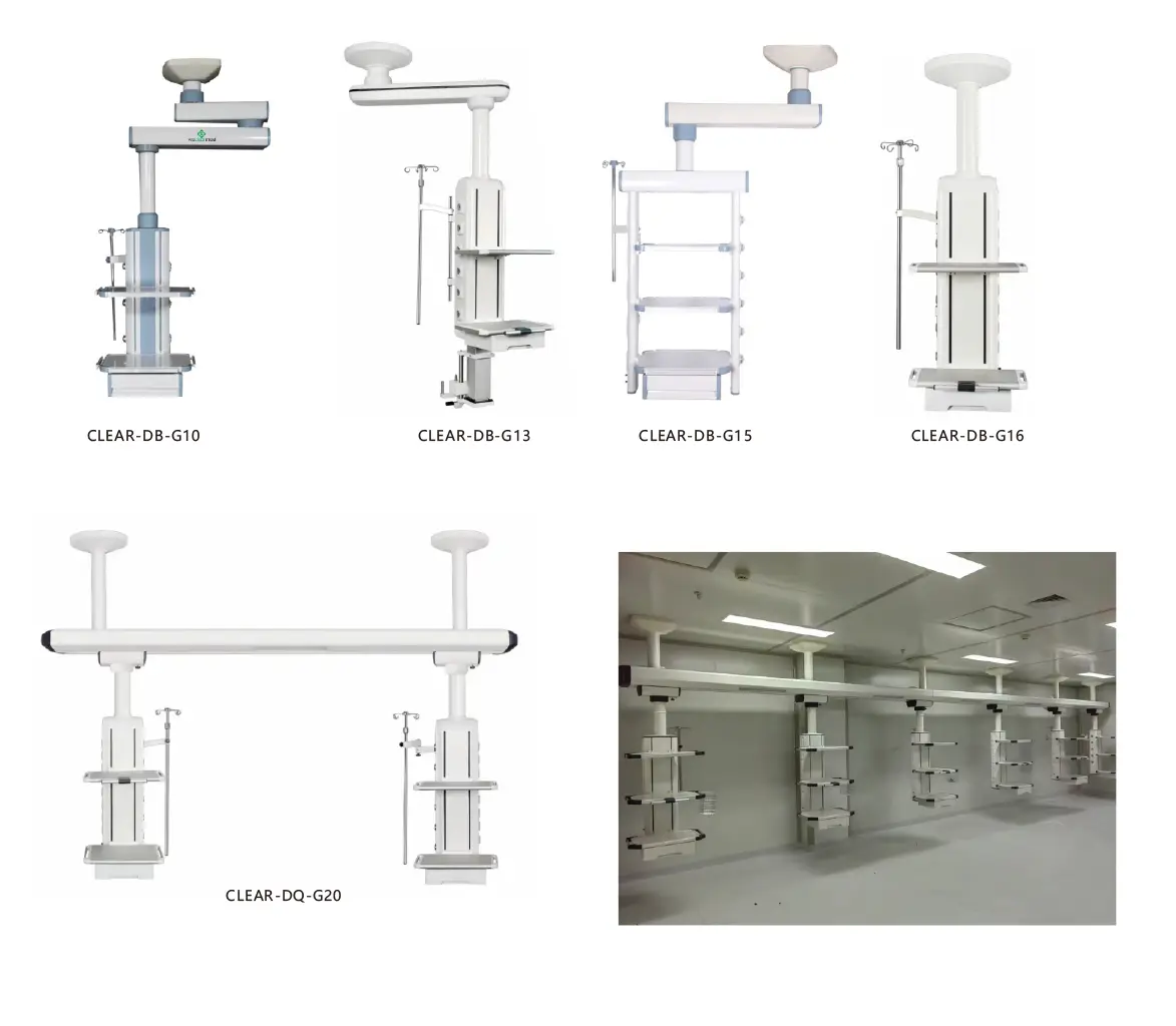 1. Clear-DB-G10 Seria może obracać 350 stopni w obrębie określonej średnicy, w górę i w dół, podnosząc do 390 mm, zgodnie z wymaganiami personelu medycznego, łatwy w ruchu i blokowaniu pozycji zawieszka.